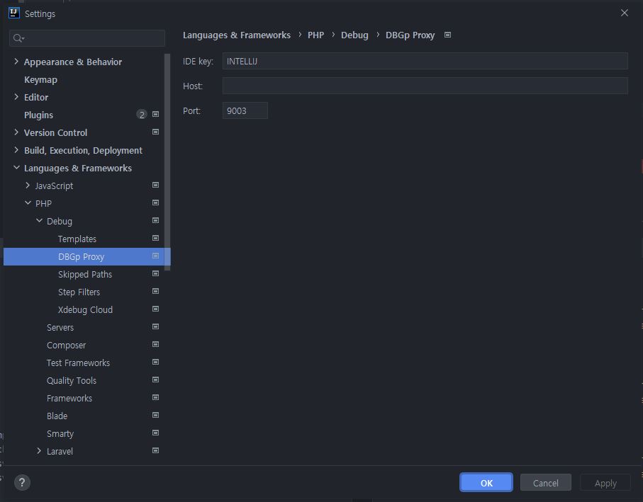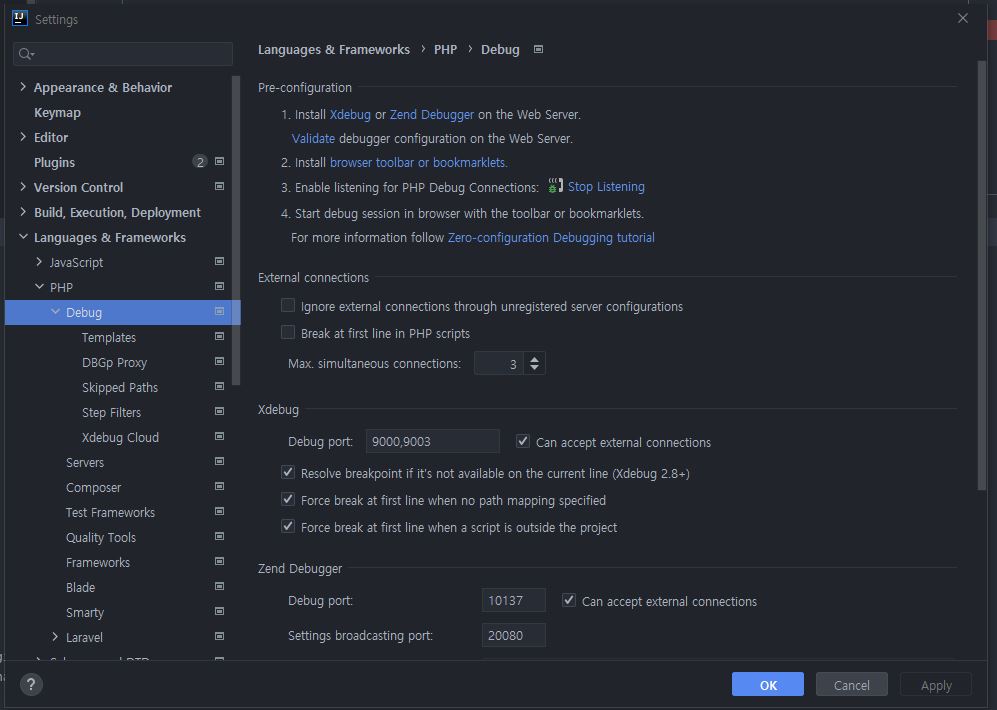 - Debug -> Xdebug 부분에 Debug port : 9000,9003